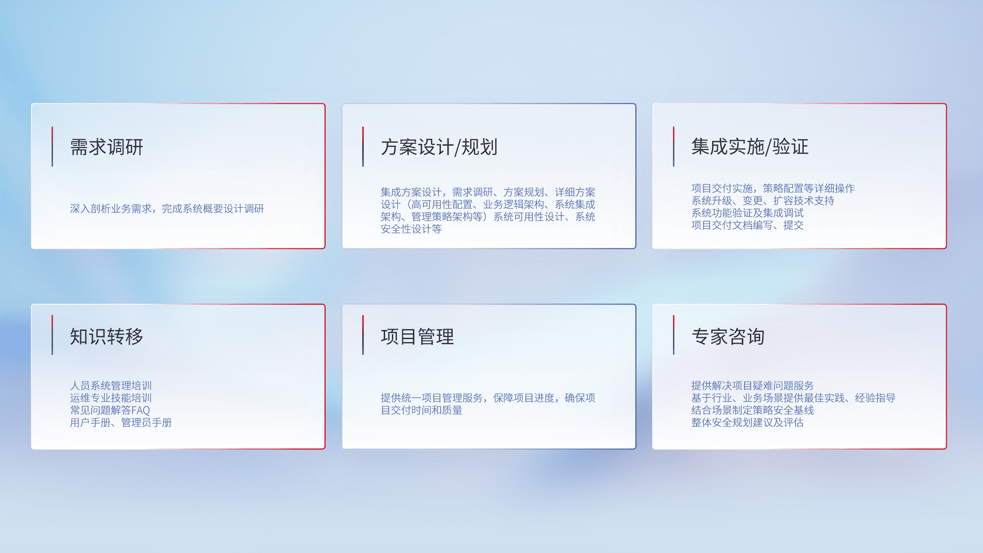 针对客户行业特性,,将宏观的安全战略和需求,,,通过专业的交付服务,,,,实现项目落地,,,为客户提供标准规范的集成交付服务。。。